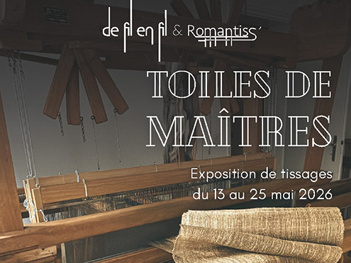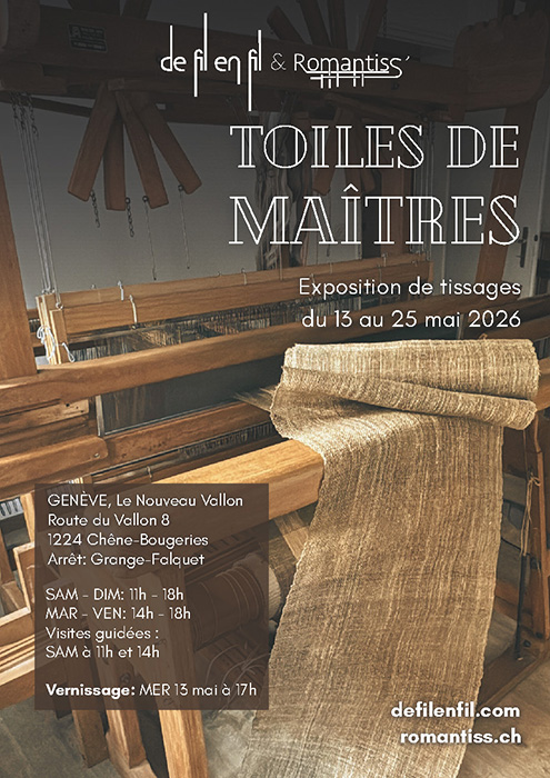 13mai 2026 au 25mai 2026 Toiles de maîtres : exposition de tissages Espace Nouveau Vallon - route du Vallon 8 Contact Jelena Godjevac & Nicole Genoud E-mail T 079 236 58 20 defilenfil.com romantiss.ch Voir le calendrier